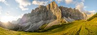 Panoramafoto van een zonnige septemberochtend bij de Falkenhütte in het Karwendelmassief in Tirol (Oostenrijk). De zon is net op en schijnt zijn strijklicht op de rotswanden. In het midden de markante Lalidererwand met de befaamde Herzogkante in de ochtendzon.