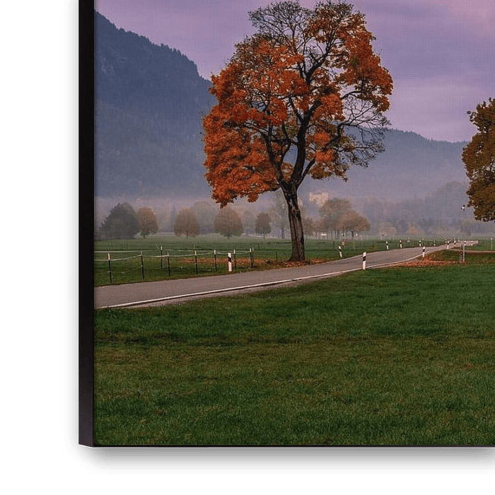 In het zachte, paarse ochtendlicht komt de pelgrimskerk St. Coloman bij Füssen prachtig tot leven. De combinatie van herfstkleuren, licht nevelende velden en een lucht vol violette tinten geeft het landschap een bijna dromerige sfeer. Terwijl de Alpen langzaam uit de ochtendmist tevoorschijn komen, blijft de omgeving opmerkelijk rustig—een moment waarop Beieren zijn meest verstilde en poëtische gezicht laat zien. Perfect voor reizigers die de magie van de Allgäu in haar puurste vorm willen ervaren.