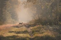 In het eerste zachte licht van de ochtend waagt een ree zich voorzichtig over het stille bospad.