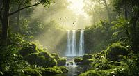 Dompel jezelf onder in een ongerept boslandschap waar kristalhelder water zachtjes over met mos bedekte rotsen in een glinsterende poel stroomt. Weelderig groen omringt de waterval, terwijl de zonnestralen in zachte stralen door het bladerdak breken. Een zwerm vogels danst elegant boven de poel en geeft het tafereel een levendige lichtheid.