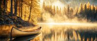 Een schilderachtig scenario ontvouwt zich met gouden licht dat het kalme meer streelt. Het zachte spel van mist verleent het landschap een dromerige uitstraling, terwijl de eenzame kano uitnodigend aan de rand van de oever ligt. Deze harmonieuze compositie is perfect voor de woonkamer, waar het een gevoel van rust en nabijheid tot de natuur uitstraalt.