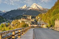 Uitzicht vanaf de Locksteinstraße in de richting van het centrum van Berchtesgaden met het Koninklijk Kasteel, dat wordt verlicht door de eerste zonnestralen van de dag. Op de achtergrond verrijst de nog besneeuwde Watzmann.