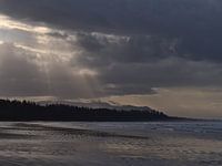 Zonnestralen breken door de bewolkte hemel boven het populaire Long Beach strand bij Tofino in het Pacific Rim National Park Reserve op Vancouver Island, British Columbia, Canada aan de Stille Oceaan door een woeste zee met de contouren van regenwoud en heuvels.