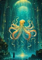 Op de afbeelding drijft een grote, gouden octopus in een groenblauw onderwaterlandschap. De octopus heeft oranje tentakels en is centraal geplaatst, verlicht door een heldere lichtbron erboven. Onder de octopus staat een figuur in een donkere jas op een reflecterend oppervlak naar het wezen te staren. De omringende architectuur bestaat uit hoge, donkere structuren met gloeiende, lineaire details.