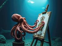 Octopus schildert op een doek onder water en houdt de kwast vast met zijn tentakels