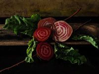 Een stilleven van Chioggia bieten en bietenblad op een brocante houten schaal