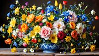 Wat dit kunstwerk extra speciaal maakt, is de sierlijke vaas waarin de bloemen zijn gerangschikt. Deze klassieke Delftsblauwe vaas voegt een authentiek en traditioneel Nederlands tintje toe, wat het geheel niet alleen visueel aantrekkelijk, maar ook cultureel rijk maakt. Het samenspel van de frisse bloemen met de verfijnde details van de Delftsblauwe patronen zorgt voor een tijdloze uitstraling die zowel moderne als klassieke interieurs kan verfraaien.