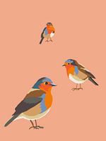 Dit digitale kunstwerk toont drie charmante roodborstjes in een warme, minimalistische setting. Tegen een zachte perzikkleurige achtergrond komen hun levendige oranje borst en subtiele blauwtinten prachtig naar voren. Elk vogeltje heeft een eigen houding en uitstraling: nieuwsgierig, alert en bedachtzaam.