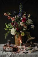 Een rijk en sfeervol stilleven waarin bloemen en handwerk elkaar ontmoeten. De kleurrijke bloemen in een vintage vaas worden omringd door garens, scharen, meetlinten en een brandende kaars. Een stille ode aan creativiteit, vakmanschap en rust. Elk detail vertelt een verhaal van tijd en toewijding, met een warme knipoog naar vroeger. Een inspirerend kunstwerk voor wie schoonheid ziet in het alledaagse.