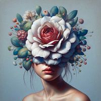 Het portret van een vrouw met een hoofdtooi gemaakt van een grote bloem.