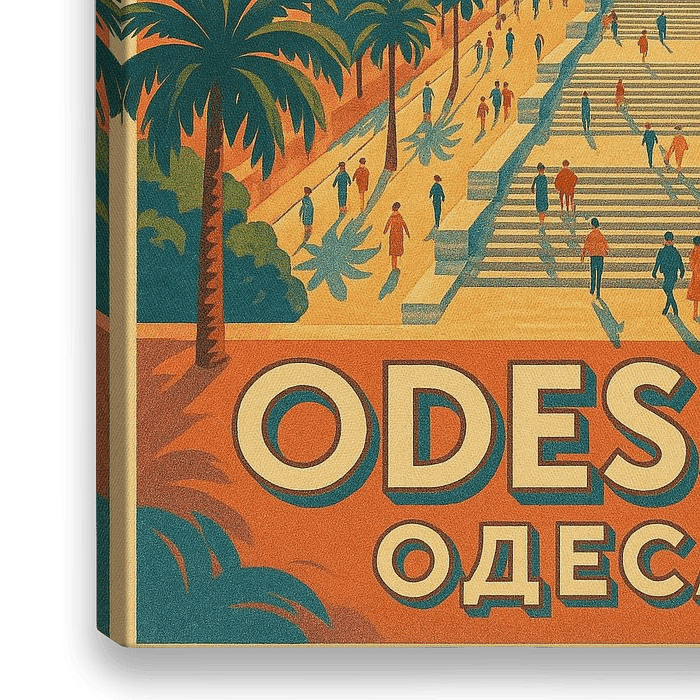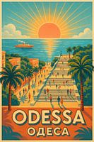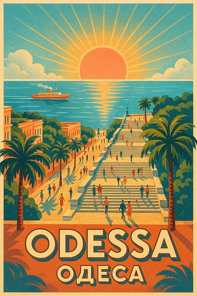 Voel de warme bries van de Zwarte Zee met deze levendige, nostalgische poster van Odessa. Het kunstwerk creëert een prachtig perspectief dat neerkijkt op de beroemde Potemkin Trap, de meest iconische bezienswaardigheid van de stad die dient als de grote ingang vanaf de zee. De trap is gevuld met kleine figuurtjes van lokale bewoners en…