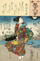 Danseres Giô tijdens een maanverlichte nacht op de Saga vlakte. Isami Tomokichirô in gevecht met Rokuya Ongundayû, die zojuist een mes in het zwaard van Tomokichirô heeft gegooid. Scene uit een kabukitoneelstuk. Gedicht door Ôe no Chisato, een dichter uit de negende, begin tiende eeuw.
