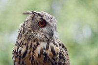 Oehoe ( Bubo bubo ), hoofdportret, gedetailleerde foto tegen een prachtige natuurlijke achtergrond, Europa.