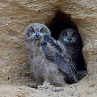 Oehoekuilen ( Bubo bubo ), Europese oehoe, twee jonge vogels zitten in de ingang van hun nesthol en kijken, wild, Europa.