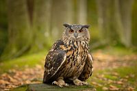 Met zijn feloranje ogen en imposante gestalte straalt deze Oehoe uil pure kracht en mysterie uit. Zittend op een bemoste stronk, midden in het bos, lijkt hij zijn omgeving nauwlettend in de gaten te houden. De warme tinten van zijn veren gaan prachtig op in het herfstachtige decor, terwijl de zachte onscherpte op de achtergrond de focus volledig op zijn indringende blik legt. Een iconisch beeld van de grootste uil van Europa.