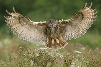 Oehoe in vlucht land in bloemenweide