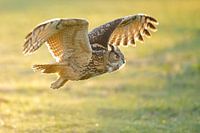 Een Oehoe in de vlucht met tegenlicht in het gouden uurtje aan het eind van de dag.