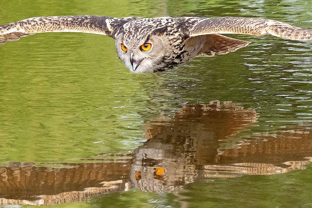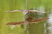 Oehoe scherend over het water is genomen gefotografeerd in Lunteren op de Veluwe. De vliegende Oehoe is met een hoge Iso gefotografeerd.