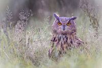 Deze oehoe landde in het weiland om op muisjes te jagen. De oorpluimen zijn hier goed zichtbaar.