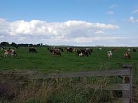 Een weiland vol grazende koeien, (Uitgeest, Noord-Holland). Op de achtergrond een licht bewolkte lucht.