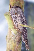 Oeraluil (Strix uralensis) in de winter in het dierenverblijf in het Nationale Park van het Beierse Woud, Beieren, Duitsland.