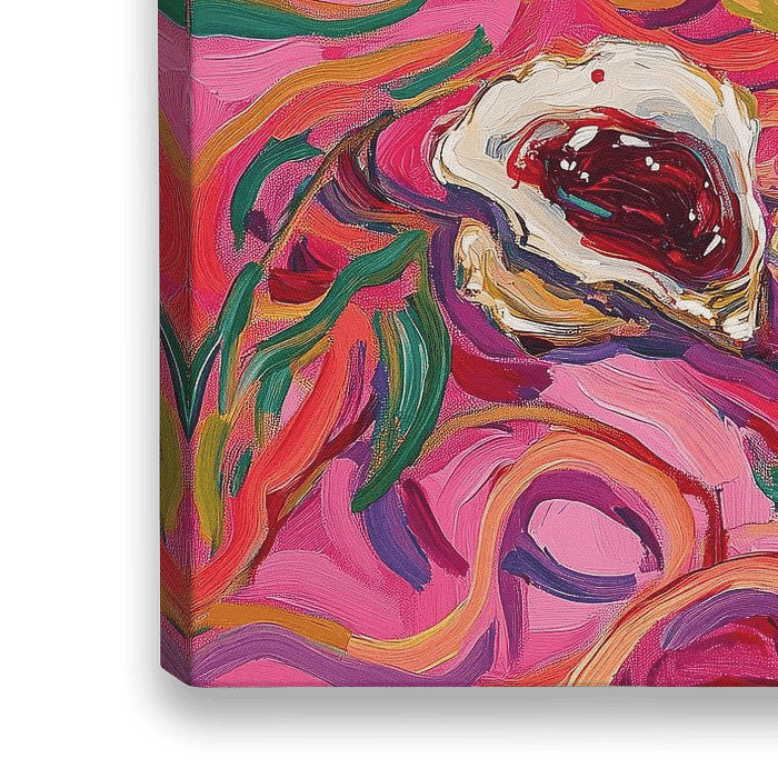 Deze explosieve en abstracte interpretatie van een klassiek stilleven tilt het tafereel van oesters, citroenen en rode wijn naar een zintuiglijke, bijna psychedelische dimensie. Het doek is doordrenkt van golvende lijnen, dikke penseelstreken en een gedurfd kleurenpalet van fuchsia, karmozijnrood, citroengeel en smaragdgroen. De energie spat van het beeld af: elke oester is opengebroken en gevuld met dieprode verf die lijkt te pulseren — als vloeibare passie of een symbolisch hart.