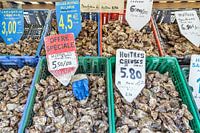Prachtige opname van verschillende oesters te koop bij een oesterkwekerij op het strand van Cancale, Frankrijk, in Bretagne in de zomer