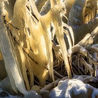 Oever ijs sculptuur gevormd door wind en bevriezend opspattend water.
