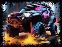 Een futuristische terreinwagen scheurt door een ravijn en dompelt de kijker onder in een fictieve gamewereld. Het momentopname boordevol actie met kleurexplosies toont de abstract getekende auto in een moderne stedelijke structuur. Felle kleuren vormen het contrast met de donkere accenten. Een indruk die niet alleen gamers en autofreaks zal bekoren. Supercool straatbeeld dat de aandacht trekt. Het motief werd gecreëerd in samenwerking met kunstmatige intelligentie en verfijnd door de foto-ontwerper tot zijn uiteindelijke uiterlijk.
