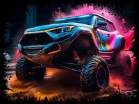 Een futuristische terreinwagen scheurt door een ravijn en dompelt de kijker onder in een fictieve gamewereld. Het momentopname boordevol actie met kleurexplosies toont de abstract getekende auto in een moderne stedelijke structuur. Felle kleuren vormen het contrast met de donkere accenten. Een indruk die niet alleen gamers en autofreaks…
