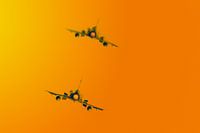 2 straaljagers vliegen in de oranje lucht.