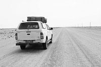 Reizen met een Toyota Hilux 4x4 met daktent (tent) over een onverharde gravel weg door een oneindig leeg woestijnlandschap, Walvisbaai, Outback van Namibië, Afrika. Off road, het avontuur tegemoet. Deze 4WD terreinwagen is een ideaal vervoermiddel voor een expeditie door de Namib woestijn. Roadtrip adventure, aan het einde van de wereld.