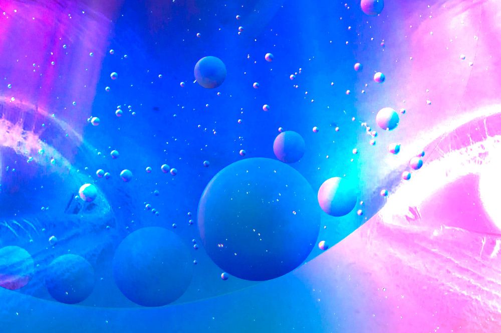 Ogen, in negatief, kijken door felle gekleurde cirkels en bubbels