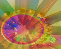 Abstracte foto met ogen, kleurpotloden en cirkels. Circa 14 foto's in 1 beeld.