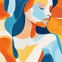 Een dromerig portret van een vrouw met gesloten ogen, weergegeven in een krachtige compositie van heldere kleuren zoals oranje, geel en zachtblauw. De abstracte vormen versterken het gevoel van introspectie, kwetsbaarheid en innerlijke rust.