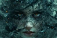 Het intense portret van een figuur wiens ogen een ongewone diepte hebben, alsof ze recht in de ziel kunnen kijken. De ogen lijken oude Germaanse of Keltische legendes te vertellen, vol magie en onverklaarbare krachten. Het gezicht is omgeven door een zwarte sluier die op rook lijkt en de mystieke uitstraling van de figuur benadrukt. De kleuren zijn koud en donker, wat de spirituele en mysterieuze sfeer verdiept en de kijker meeneemt naar een andere wereld, misschien zelfs naar een andere staat van zijn.