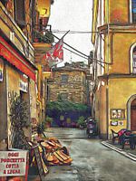 Een populair gezicht in de meeste steden en dorpen waar ik woon in Umbrië, Italië, is een mobiel busje/winkel die gekookt varkensvlees verkoopt. Mensen staan in de rij om broodjes gevuld met vers gekookt varkensvlees te kopen. Veel winkels en delicatessenwinkels verkopen het ook. Hier, in Passignano Sul Trasimeno, zien we een winkel met een trots bord waarop staat "Oggi Porchetta Cotta A Legna", wat betekent: vandaag varkensvlees gekookt op houtvuur.