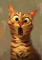 Een eenvoudig maar fascinerend portret van een kat gevangen in een moment van shock. De levendige kleuren en strakke lijnen maken dit een charmante toevoeging aan elke kamer.