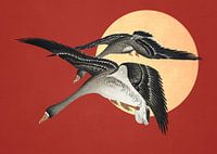 Ik heb zijn portret van twee ganzen bij volle maan digitaal bewerkt, vereenvoudigd en op een rode achtergrond geplaatst. Ik wilde de oorspronkelijke schoonheid van het kunstwerk bewaren en het tegelijkertijd iets moderner maken en er wat "Hotel Chique" aan meegeven.
