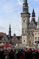 De Grote Markt in Aalst tijdens de unieke 'Voil Janetten' optocht , tijdens het jaarlijkse carnavalsfeest in Vlaanderen. Met het historische gebouw Belfort op de achtergrond. Aalst is gastheer van één van de grootste Mardi Gras vieringen in België.