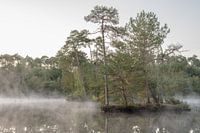 landschap op de Oisterwijkse vennen in Oisterwijk, Noord-Brabant, met zicht op verschillende eilandjes in het mistige ven