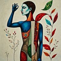 Met dit schilderij wilde ik de delicate harmonie tussen mens en natuur vastleggen. De centrale figuur, geschilderd in levendig blauw, straalt een rustig vertrouwen uit, met zijn 'OK'-gebaar dat acceptatie en optimisme belichaamt tegenover de complexiteit van het leven. Patronen op het gesegmenteerde lichaam van de figuur vertellen…