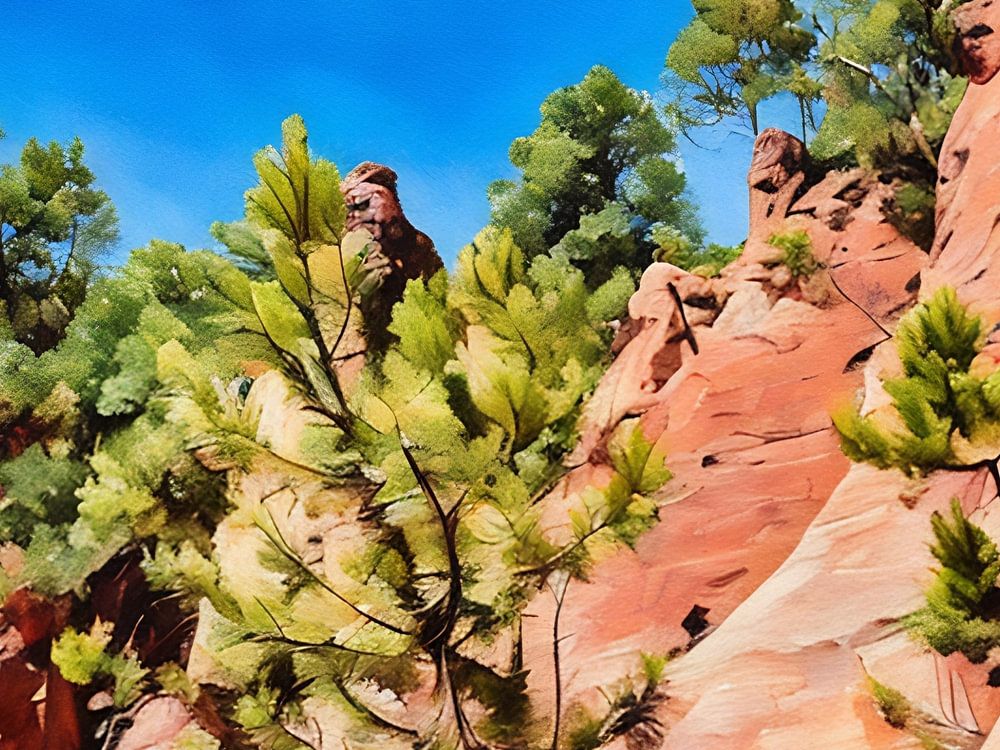 Deze foto toont een prachtig kliflandschap versierd met weelderige groene bomen. De rotsachtige formaties vertonen een reeks warme tinten, van zandgeel tot dieprood, wat een opvallend contrast vormt met de levendige blauwe lucht. De scène vangt de schoonheid van de natuur's ruige terrein en de veerkracht van bomen die groeien op steile, rotsachtige oppervlakken.