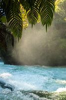 Door de varens in de linkerboven hoek en de waterdamp op de achtergrond krijg je een tropisch en warom beeld. Het zonlicht schijnt prachtig door de balderen heen waardoor je goed de prachtige kleur blauw van het water ziet.