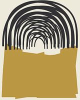 Een abstract en modern Mid Eeuw Modern schilderij in neutraal beige, zwart en okergeel goud in Scandinavische stijl. Een rustgevende abstractie met geometrische vormen en regenbogen om te ontspannen.
