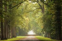 De sprookjesachtige toegangsweg naar kasteel Moersbergen in Doorn, nationaal park Utrechtse Heuvelrug. Een mistige ochtend aan het begin van de herfst.