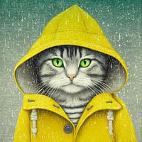 Een grijze tabby kat met opvallende groene ogen draagt een felgele mackintosh met een capuchon. Op de achtergrond zijn regendruppels te zien, waardoor een speels en grillig tafereel ontstaat.