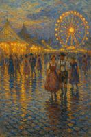 Dit levendige impressionistische tafereel vangt de magie van het Oktoberfest in de schemering - dat betoverende moment waarop de lucht blauw kleurt en elke lantaarn, tent en kermisverlichting begint te gloeien. Het kunstwerk combineert prachtig culturele sfeer met schilderkunstige elegantie: figuren gekleed in traditionele Beierse…