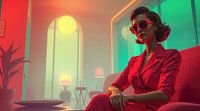De elegante vrouw in het beeld, gehuld in een krachtige rode outfit, straalt zelfverzekerdheid en mysterie uit. De setting, met zijn zachte halftone patronen en minimalistische achtergrondelementen, versterkt de cinematografische sfeer. Dit contrast tussen de levendige rode tinten en de subtiele geometrische vormen maakt het werk zowel tijdloos als eigentijds.