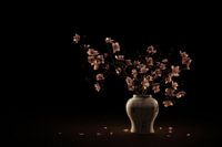 Ontluikende Magnolia takken in een zwartwit vaas met een donkere achtergrond in een dramatische lichtsetting waardoor de contouren benadrukt worden.